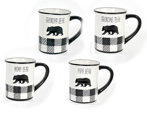 Ceramic B&W Plaid family bear mugs - 4 assorted styles per set.