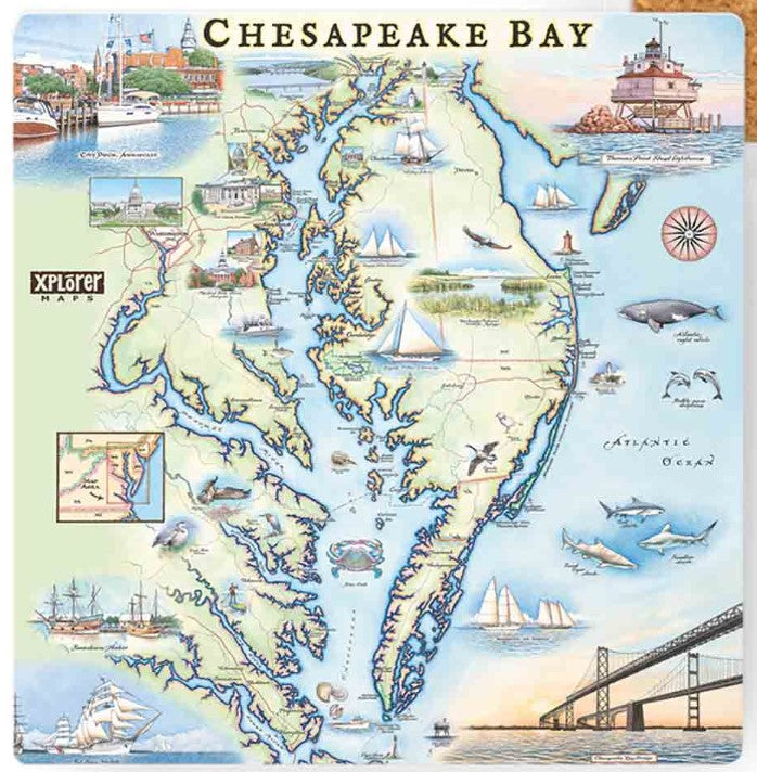 Original, hand-drawn story map and accompanying gifts of Chesapeake Bay by renowned Illustrator and Xplorer Maps Co-Founder, Chris Robitaille.