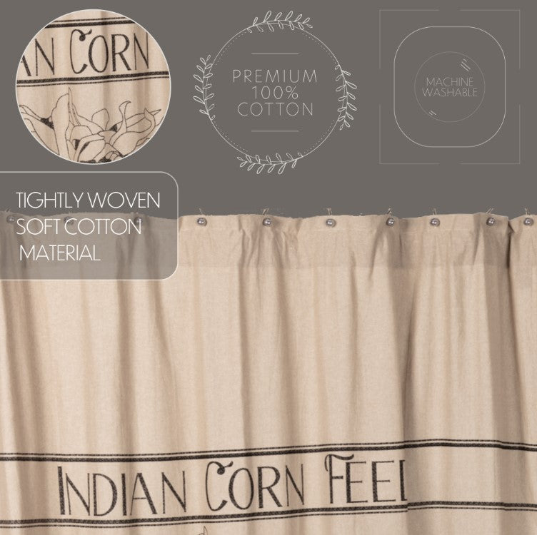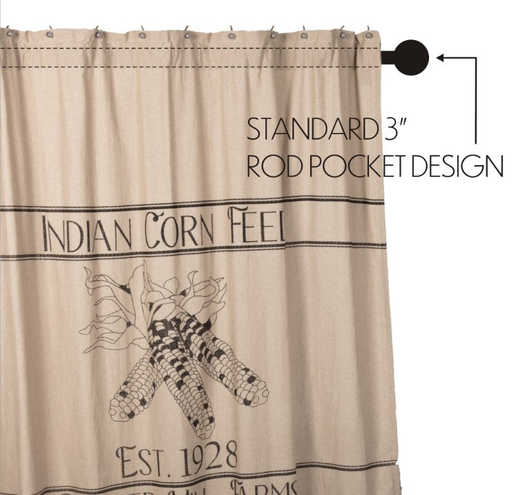 Add classic country charm to your farmhouse bathroom with our Sawyer Mill Charcoal Corn Feed Shower Curtain. These fall shower curtains feature distressed stenciled corn feed and Sawyer Mill Farms wording. The neutral, tan chambray background gives you the versatility to decorate your country style bathroom the way you want. A generously sized rod pocket and button holes on top make it easy to hang with a curtain rod or shower hooks of your choosing (not included).