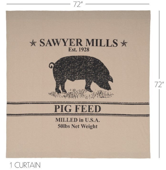 Khaki cotton and distressed black stenciling create a design to capture the essence of modern farmhouse decor. The Sawyer Mill Charcoal Pig Shower Curtain features a khaki chambray with wide black stenciling. Prominently features a stenciled grazing pig over grain-sack-style printing. Measures 72 by 72 inches to fit standard sized showers and baths. Easily hang this classic country bath curtain with shower hooks of your choosing (not included) using the button holes attached. A 3" rod pocket is also available as an alternative hanging method.
