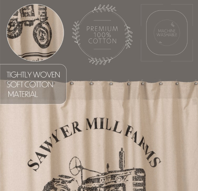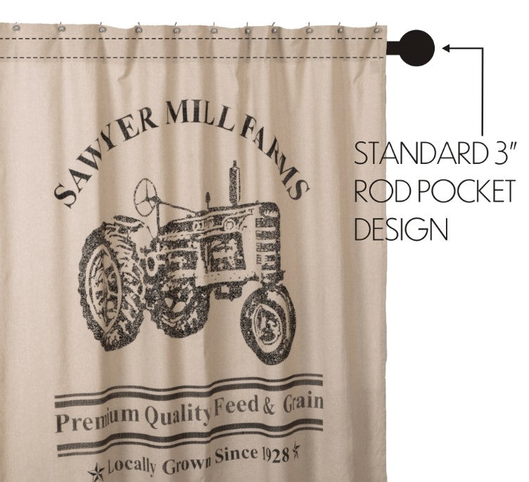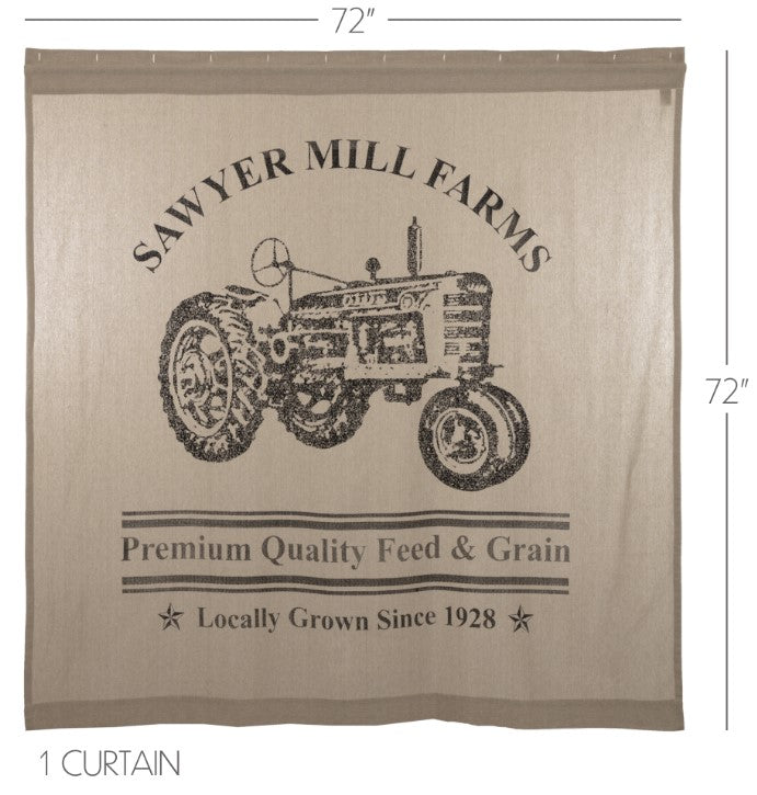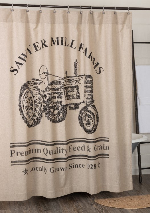 Depicting a weathered tractor in a vintage fashion with the words "Sawyer Mill Farms" above it, the Sawyer Mill Charcoal Tractor Shower Curtain lends country appeal to your bath. The phrases "Premium Quality Feed & Grain" and "Locally Grown Since 1928" calls to mind the hardworking American farmland. The charcoal and tan colors add warm, soothing colors to your home. Measures 72 by 72 inches to fit standard sized showers and baths. Easily hang this classic country bath curtain with shower hooks of your choosing (not included) using the button holes attached. A 3" rod pocket is also available as an alternative hanging method.