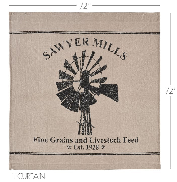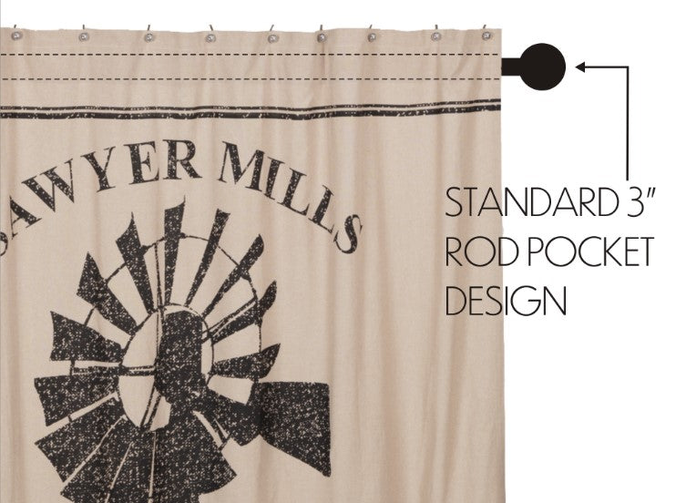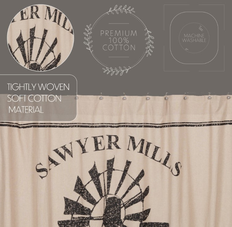 Khaki cotton and distressed black stenciling create a design to capture the essence of modern farmhouse decor. The Sawyer Mill Charcoal Windmill Shower Curtain features a khaki chambray with wide black stenciling. Prominently features a stenciled windmill over grain-sack-style printing. Measures 72 by 72 inches to fit standard sized showers and baths. Easily hang this classic country bath curtain with shower hooks of your choosing (not included) using the button holes attached. A 3" rod pocket is also available as an alternative hanging method.