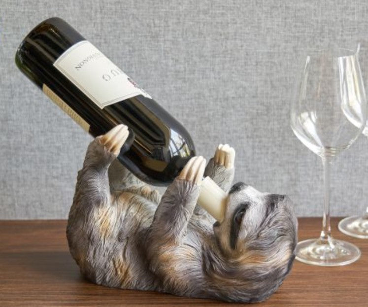 Bring some whimsy into your home with this playful animal bottle holder. This sloth holds one standard wine bottle in its mouth while it balances on its back.