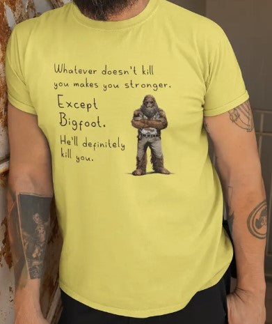 Design features a tough Sasquatch and the words "Whatever doesn't kill you makes you stronger. Except Bigfoot. He'll definitely kill you." Dtf print is durable and flexible to hold up better in the wash. *Color may not match exactly with photos. Shirt is a Gildan heavy cotton t-shirt, available in black or yellow.