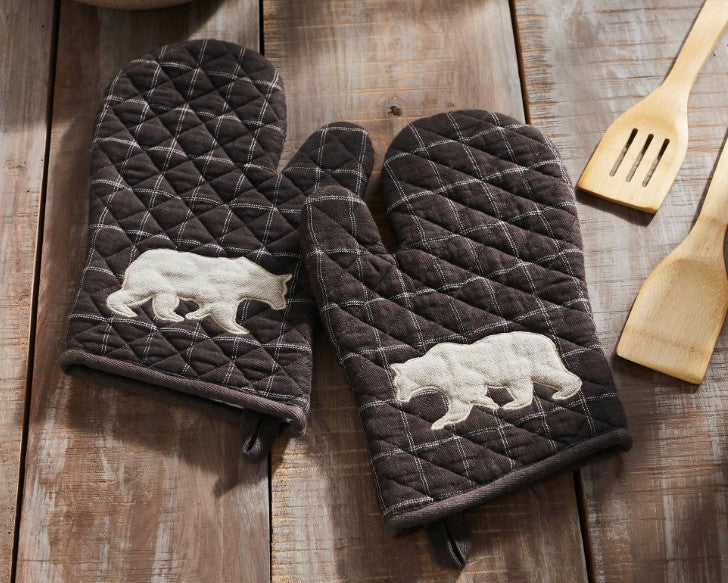 Appliqued Bear: The VHC Brands Cotton Oven Mitt Set of 2, part of the Wyatt Collection, features a creme applique bear on each oven mitt, bringing rustic and primitive style to your kitchen with its rich espresso plaid.
